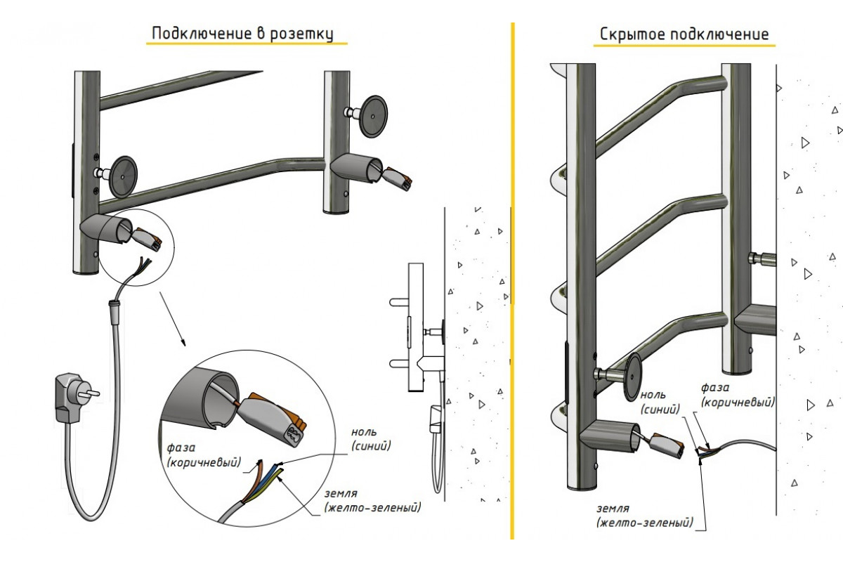 Скрытое подключение: Благодаря приваренным в нижней части вертикальных труб двум распаячным коробкам, в которых соединяется электропроводка, возможно скрытое подключение к электричеству слева и справа.