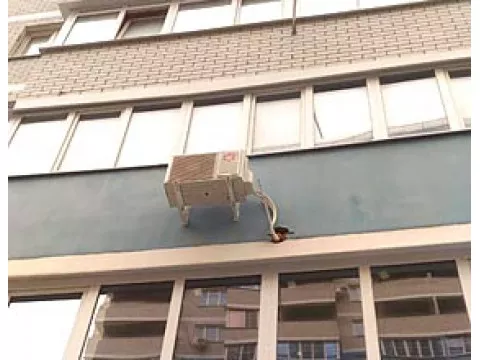 А вот крепление внешнего блока осуществлялось в сложных условиях - на высоте 3-го этаже с лестницы.