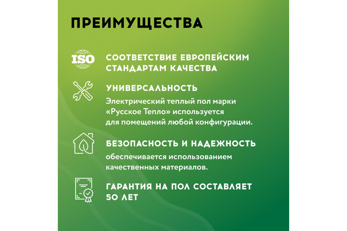 Нагревательный мат для теплого пола Русское тепло 6.0 м² 960 Вт сочетает в себе эффективность, надежность и простоту установки. Он обеспечивает комфортный обогрев пола, экономию энергии и подходит для использования в различных помещениях. Благодаря высоким стандартам качества и безопасности, этот мат является отличным выбором для создания теплого пола в вашем доме.