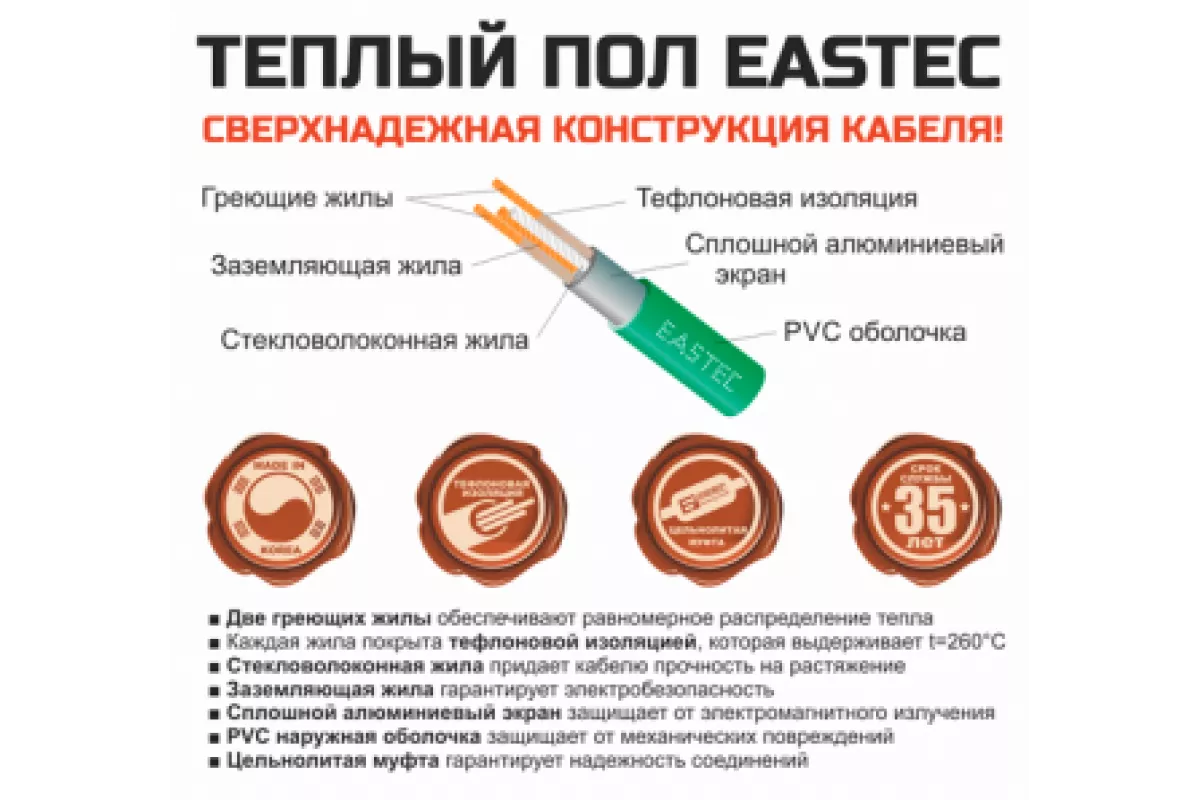 Равномерный и эффективный обогрев - Двухжильный экранированный кабель обеспечивает равномерное распределение тепла по всей поверхности, исключая зоны перегрева или недостаточного прогрева. Удельная мощность 160 Вт/м² гарантирует эффективный обогрев даже в небольших помещениях.
