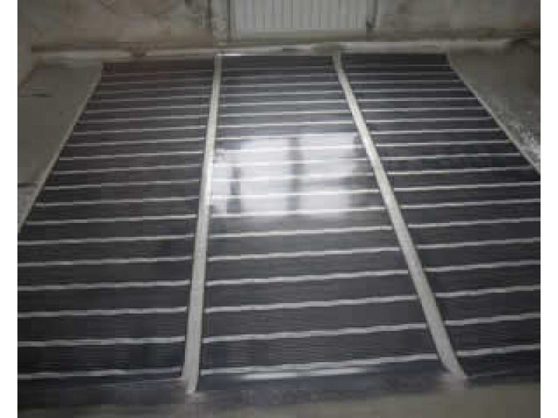 1) На площади 60 кв.м был уложен инфракрасный пленочный теплый пол Q-Term 220Вт/кв.м с шириной полосы 100 см. Для подложки использован специальный теплоотражающий материал, который необходим для предотвращения ухода тепла в бетонное основание коттеджа и повышения энергоэффективности греющей пленки.