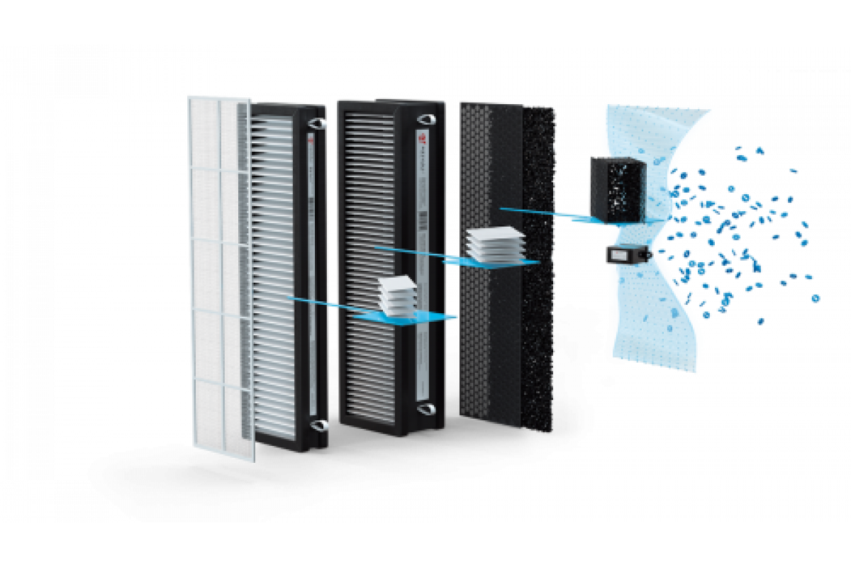 ● 5 ступенчатая система очистки воздуха: предварительный сетчатый фильтр, механический фильтр тонкой очистки F7, HEPA-фильтр медицинского класса H12, угольный фильтр и ионизатор воздуха