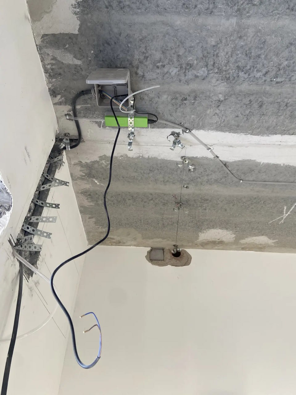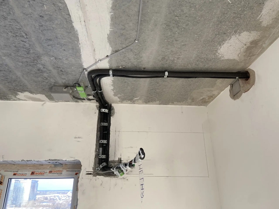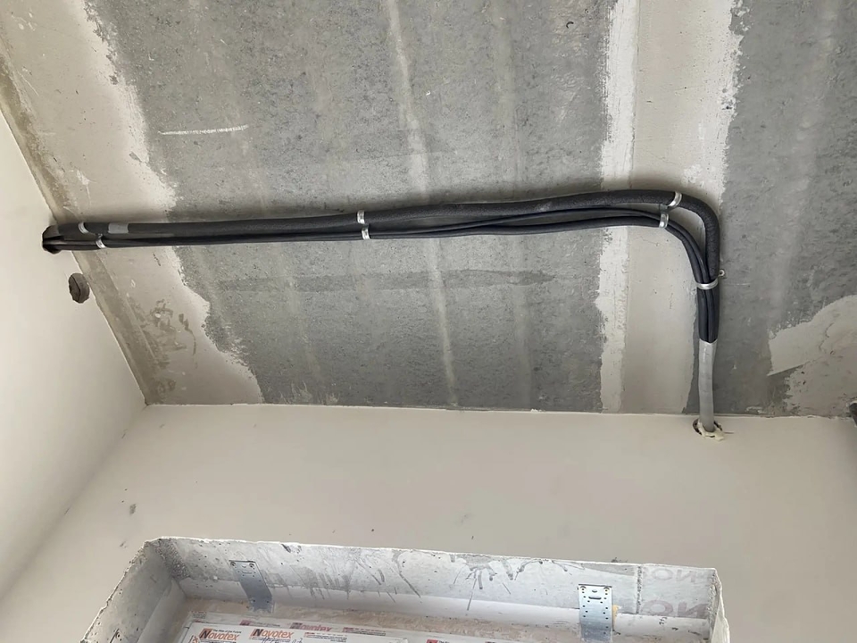 Мастера аккуратно заложили дренажную линию, проложили медные трубки, вывели силовой кабель и подготовили место для монтажа внутреннего блока. Все коммуникации были зафиксированы, теплоизолированы и подготовлены к штукатурным работам.