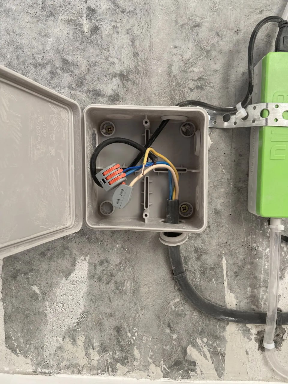 Поэтому бригада приняла профессиональное решение: установить дренажную помпу, которая будет автоматически перекачивать конденсат в канализацию.